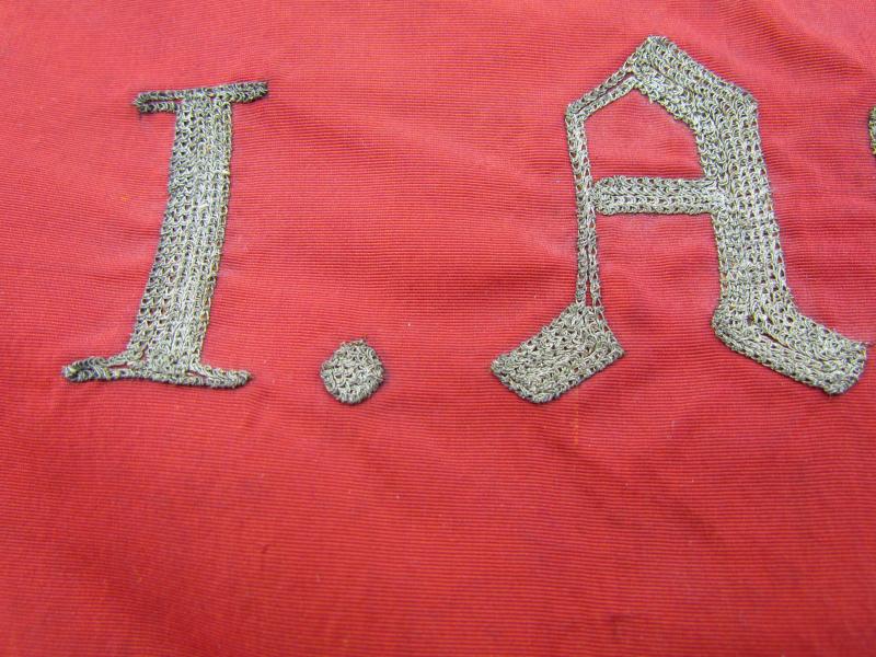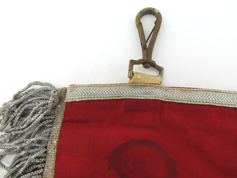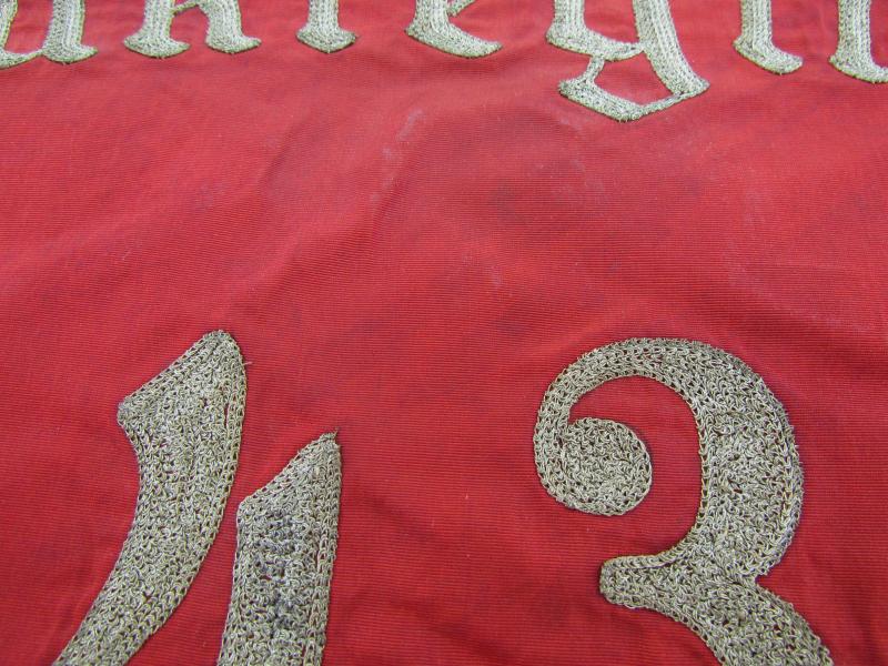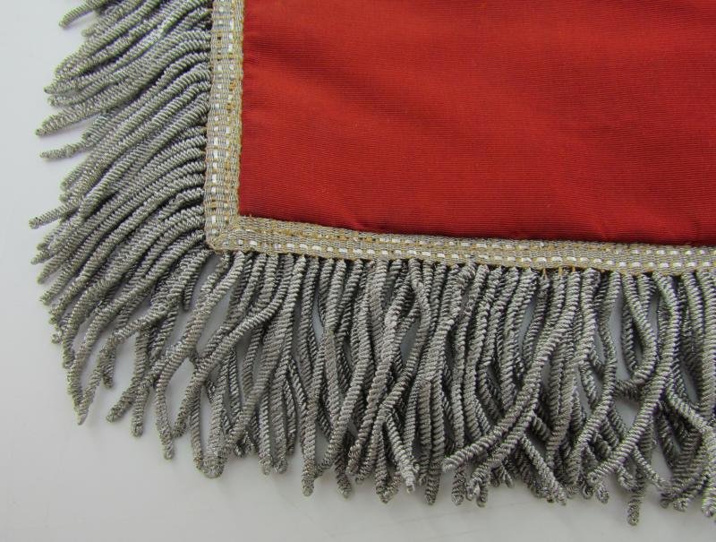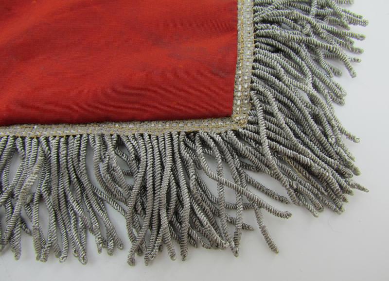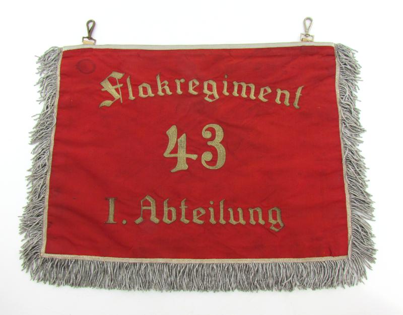 A very fine original Luftwaffe trumpet/banner cloth from Flak Regiment 43, I. Abteilung. Constructed in high-quality red fabric with silver fringe and trim, featuring the Luftwaffe eagle clutching a swastika on one side, and the unit designation “Flakregiment 43, I. Abteilung” in bullion embroidery on the reverse. Complete with the original suspension hooks for mounting on a trumpet or standard.