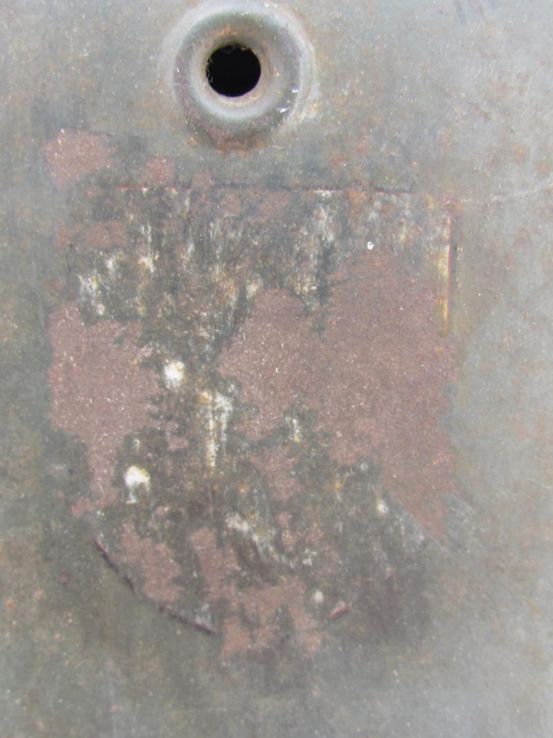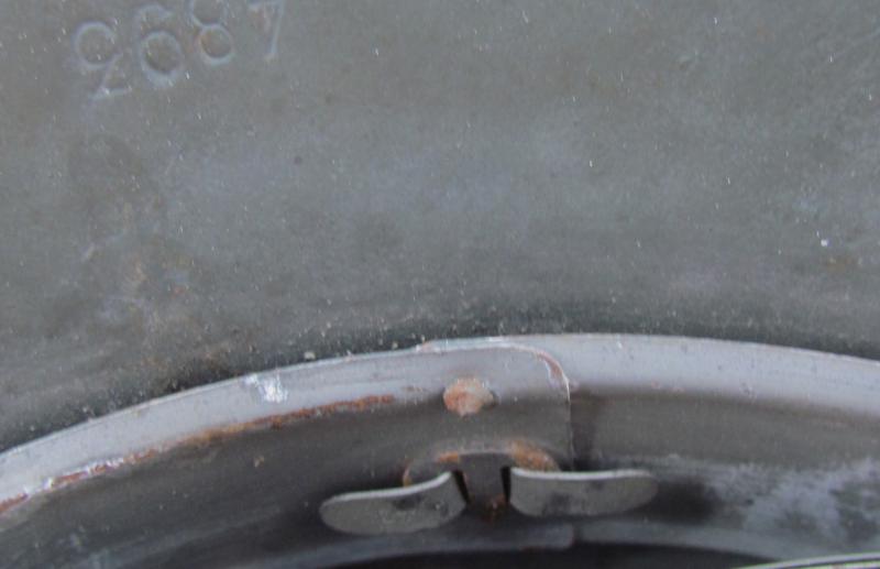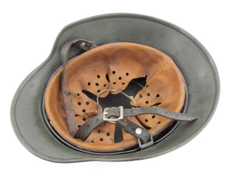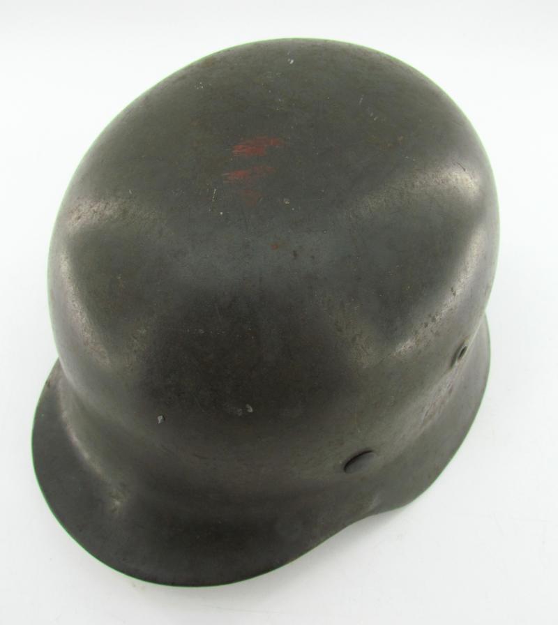 Original M40 Double Decal Combat Polizei (Police) Helmet SE66- Featuring textured dark green paint on the exterior, this helmet retains approximately 95% of its original finish, with minor scrapes evident on the top of the outside dome. Identified as an SE66 with batch number 4893. ( indicating production by Sächsische Emaillier und Stanzwerke A.G )