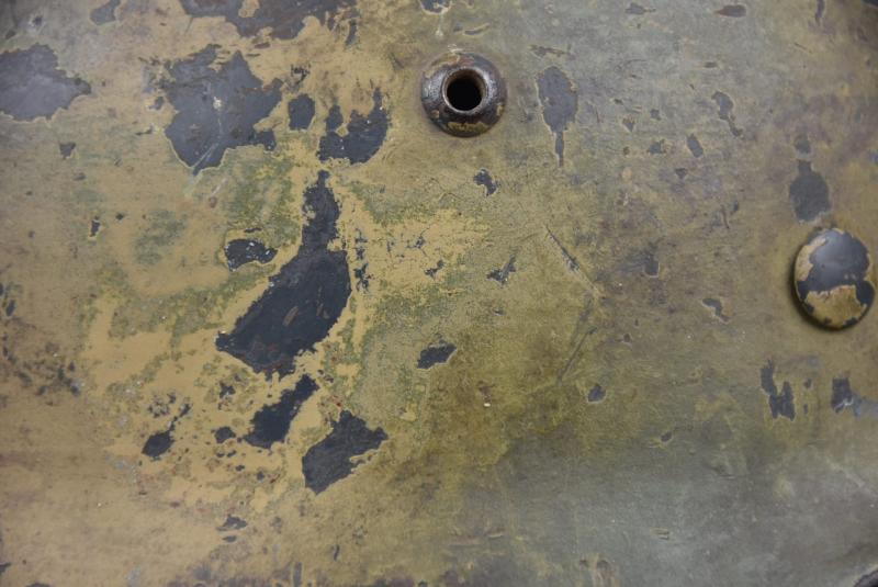 A very nice M35 steel helmet that started it’s life as a double decal example in glossy blue paint. Got camouflaged during the war, covering both decals, but there shadow is still visible under the paint. The camouflage pattern is a classic ‘Normandy’ three tone spectrum period applied by airbrush using vehicle paint. The colors remain bright and visible and paint shows normal combat damages.