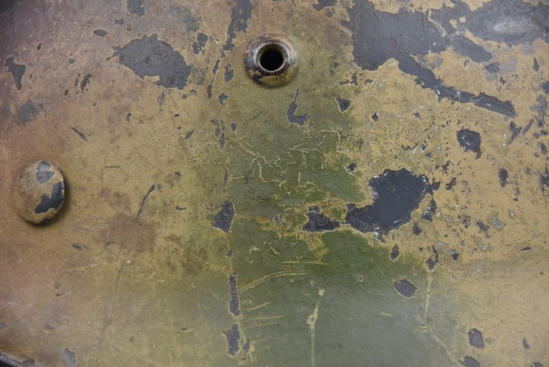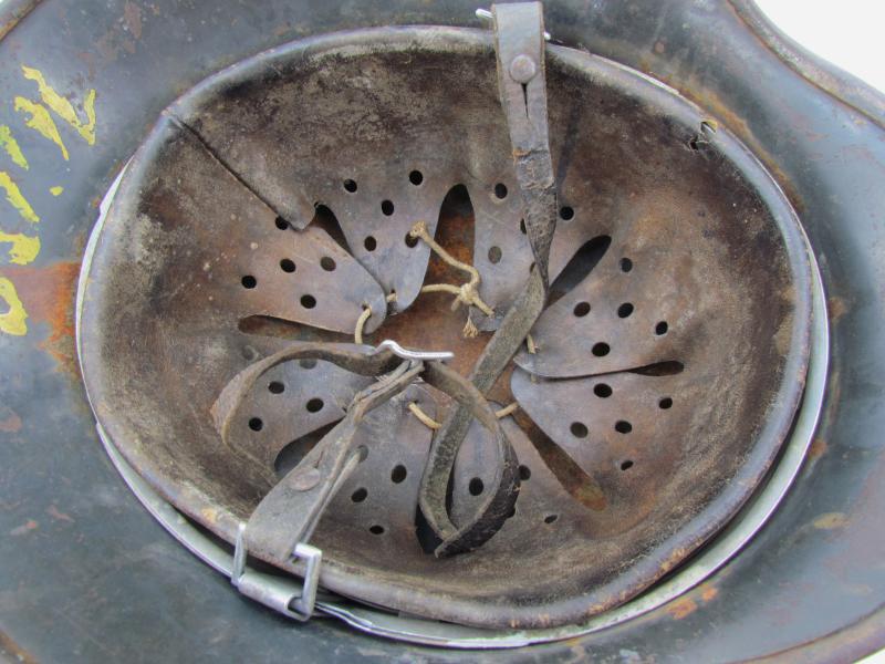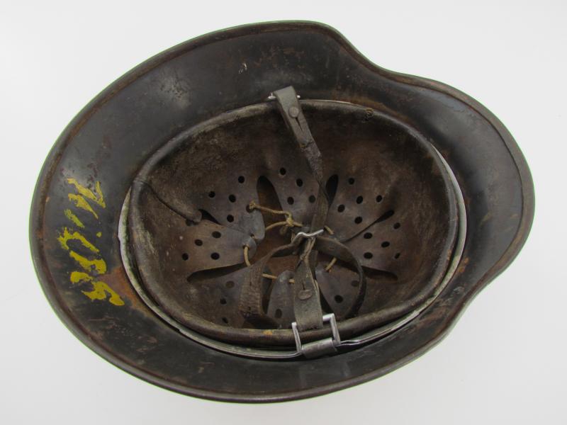 The inside remains perfect and untouched having a reinforced aluminum liner. The leather is a bit stiff but remains strong. The genuine draw string and chin strap are still present. The strap has a maker marked and dated 1938. The split pins remain straight and untouched. Has a ID-number in the rear skirt ‘1006’ painted in yellow.