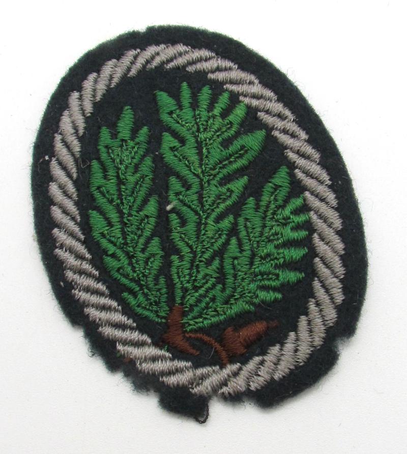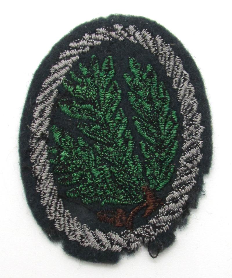 These badges were worn by the various 'Jäger' (or rifle) regiments: some sort of mid-/ie. late-war infantry units. The badge is nicely machine-embroidered on a dark-green woolen background. The badge is showing some minor moth damage.