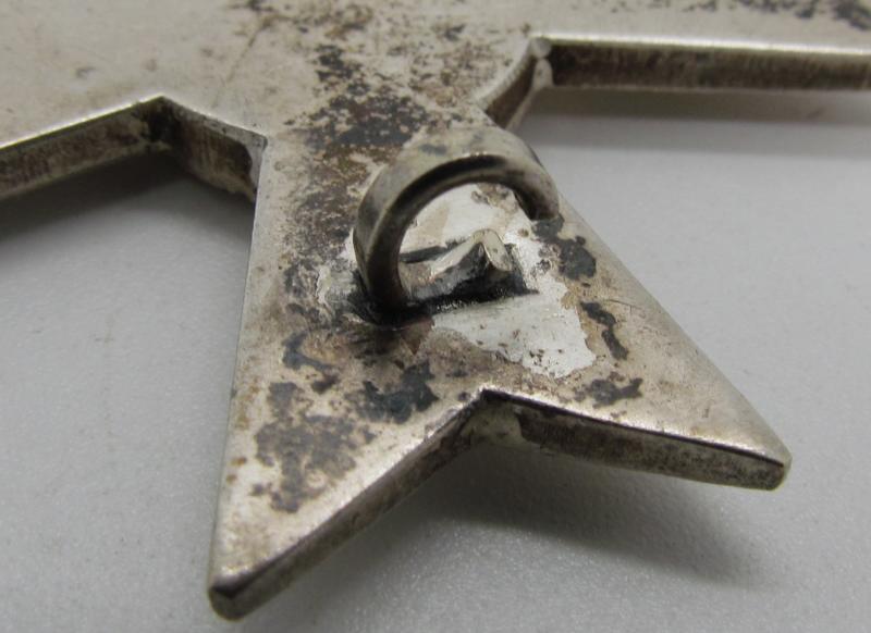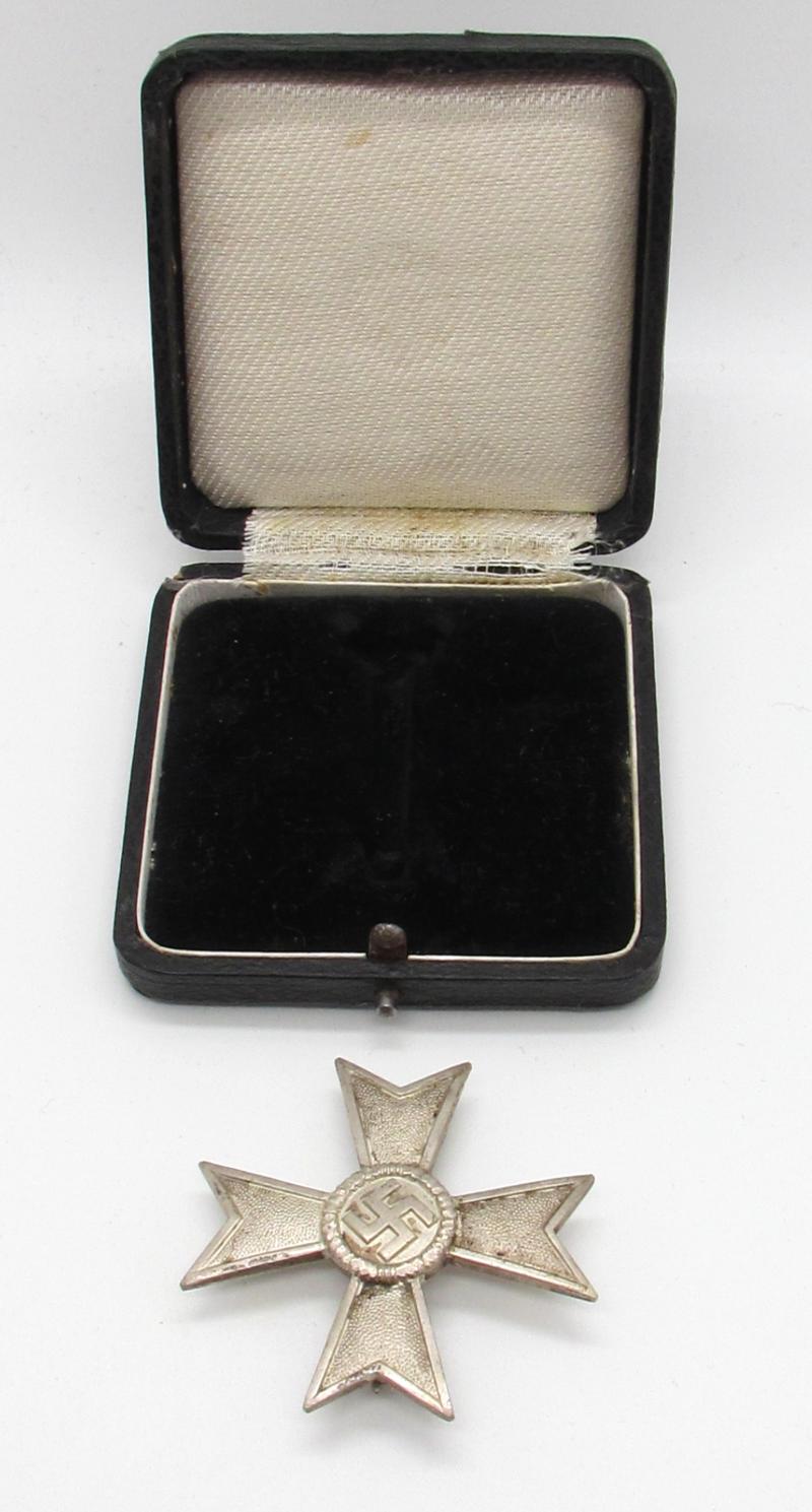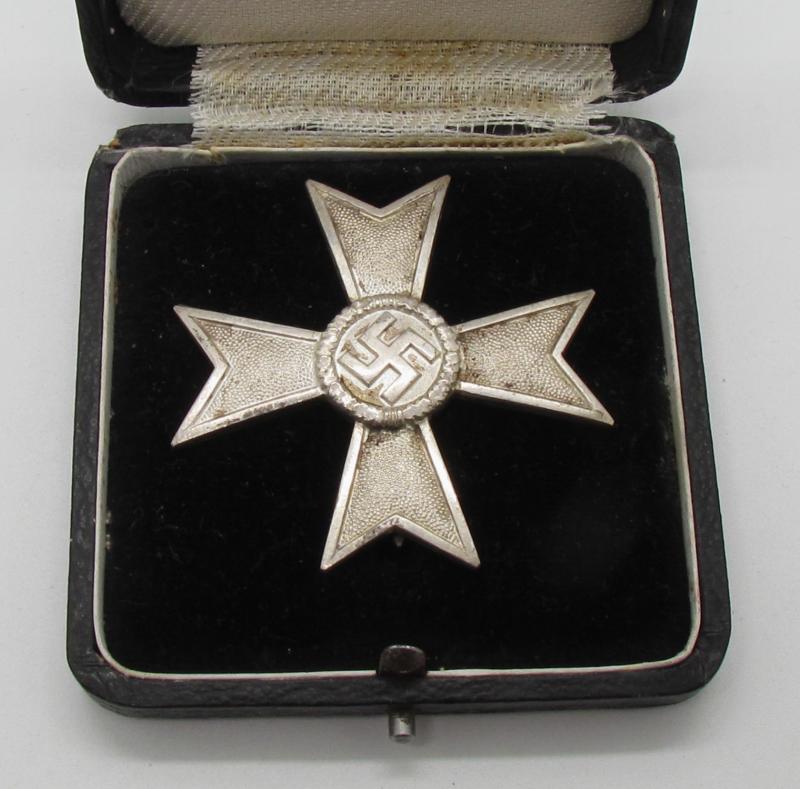 Original War Merit Cross 1st Class without Swords, awarded during WWII for exceptional service not directly related to combat. This silvered cross shows fine pebbling to the arms and a central swastika within an oak leaf wreath. Complete with its original black case of issue, featuring the silvered cross emblem on the lid.