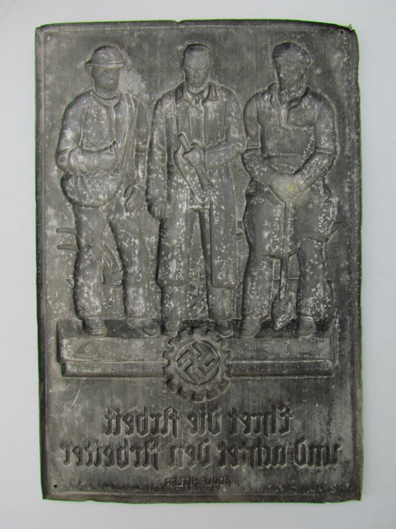 produced as an award by the "Deutsche Arbeitsfront" ("German Labor Front"), or DAF. The plaque depicts a laborer and a farmer flaking a scholar or legislator, over a swastika within a geared wheel, with Adolf Hitler's quote "Ehret die Arbeit und achtet den Arbeiter" ("Honor the Work and Respect the Worker") at bottom. The designer's name "Muller -Erfurt" appear at the bottom right of the pedestal upon which the figures stand, while the bottom right corner bears the maker's mark "Paulmann & Crone - Ludenscheid", with "Ges. Gesch." at bottom left.