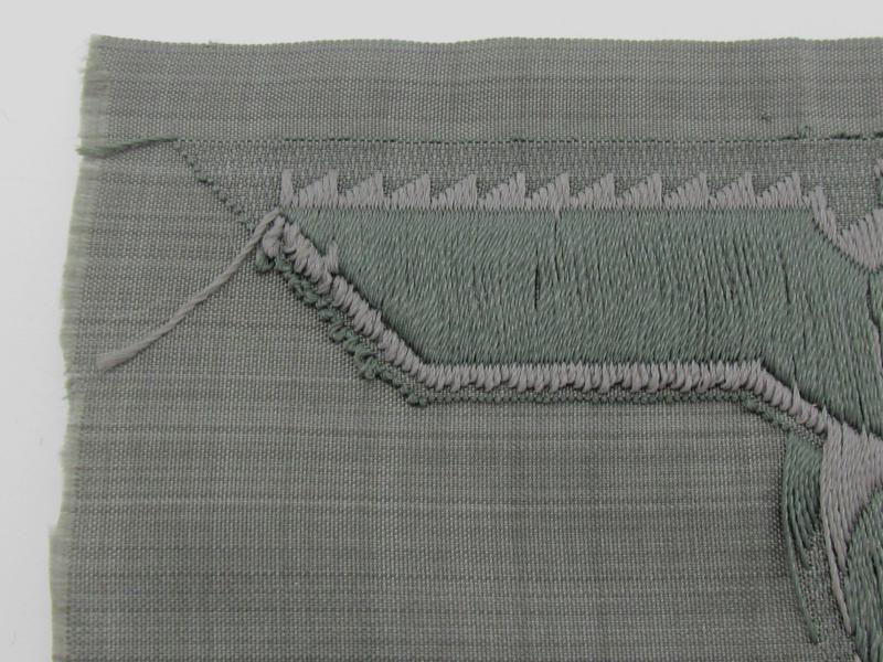 M40 pattern breast eagle. Flat woven ‘BeVo-weave’ example on field green backing. Issued on M40, M41, M42, M43 and M44 feldbluses.