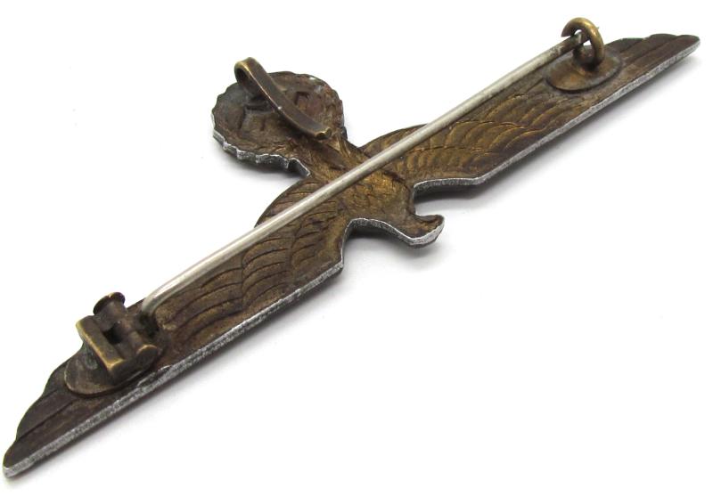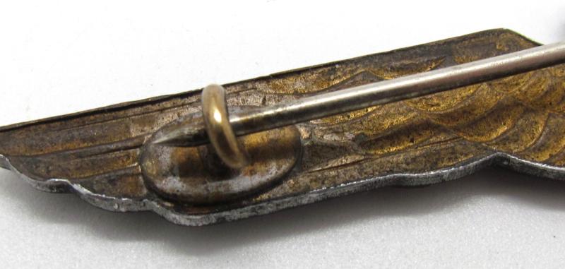 (Heer Brustadler für General). Constructed of a gilded bronze alloy, the obverse consisting of an elongated Wehrmacht eagle clutching a wreathed mobile swastika, the reverse with a block hinge and horizontal pinback meeting a round wire catch, with a stabilizing pin emanating from the wreathed, unmarked.