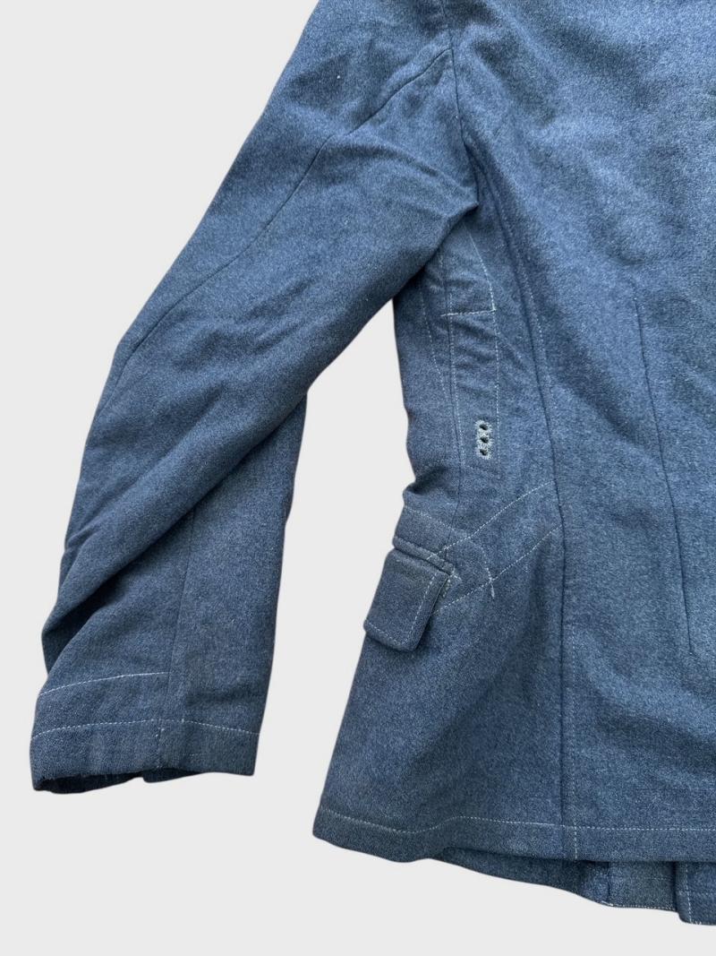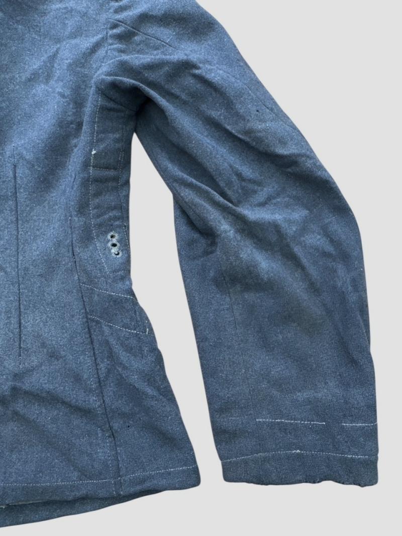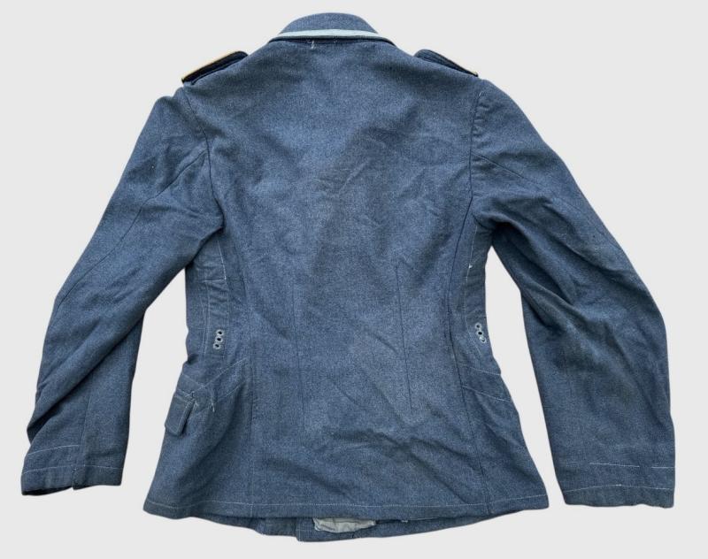 The tunic is made of high-quality blue-grey wool and retains its original insignia, including the factory applied Luftwaffe breast eagle and a ribbon for the Iron Cross 2nd Class (EK II) in the second buttonhole.