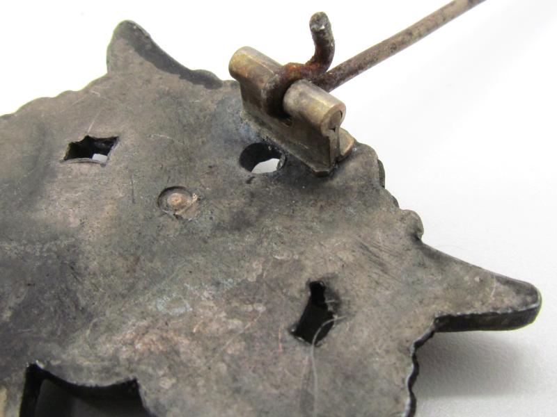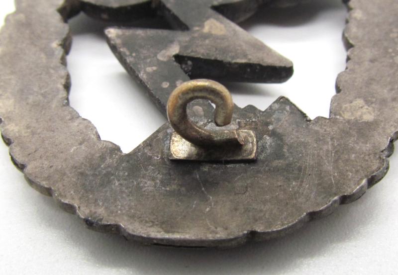 A Luftwaffe Ground Assault Badge, die-stamped two-part construction with the eagle in tombak and the wreath in zink. The reverse of the badge has a vertical pin with a crimped barrel hinge, and a round wire catch soldered on a rectangular base, unmarked by an unknown maker.