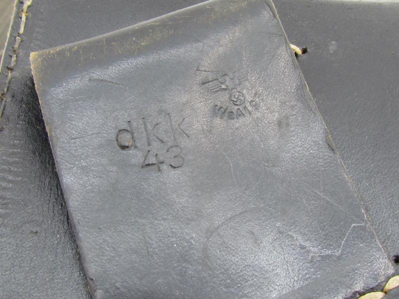 WH (Heer) K98 Rifle Grenade Launcher Pouch (Gewehrgranatgerät Tasche). The black leather pouch is complete with its original webbing carrying strap. The interior of the pouch has two, small, internal pockets for the assembly tool and sight. The pouch is nicely maker marked with 'dkk 43', indicating production by the company 'Friedrich Offermann & Söhne' from Bensberg in 1943. The pouch is nicely WaA marked as well.