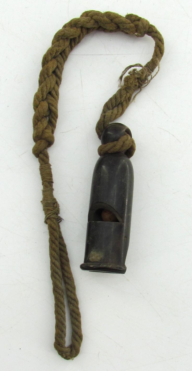 Wehrmacht issue signal whistle made from Bakelite and wood complete with its original green knotted lanyard with a clip in slightly used condition.